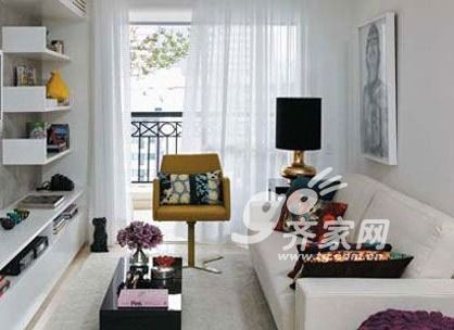 窄小狭长的小客厅容易给人压抑之感,白色是最好的客厅主色调。为了让客厅感觉宽敞一些,可以弱化客厅与阳台的隔断,用缥缈的白色纱质窗帘作为简单的分隔,拉起窗帘就能开到外面开阔自然的风景。即使需要拉上窗帘,外面的风景也隐隐若现,光线也很好。