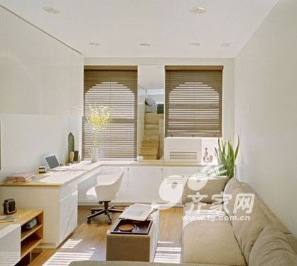 居家办公的SOHO一族一定要有一个舒适的工作区,既然没有空间单独设计书房,那么,客厅可以设计成兼顾书房的形式。靠墙的L型工作台不仅不会占用太多客厅空间,而且台面大,可以让你视野开阔。同样L型的沙发与工作台斜面相对,很有对称美,而最重要的是它让你在给工作疲惫之后可以立即享受舒适的休息。