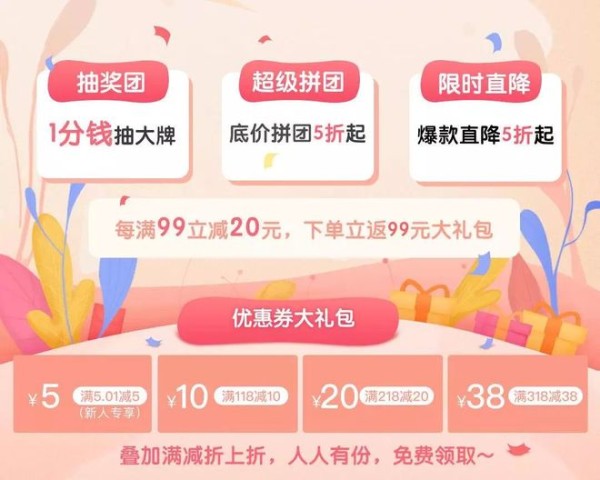除了满99-20等各种满减券,还可以叠加使用优惠券。还有「抽奖团」「限时直降」「下单有礼」等等,优惠多到选择困难症发作。