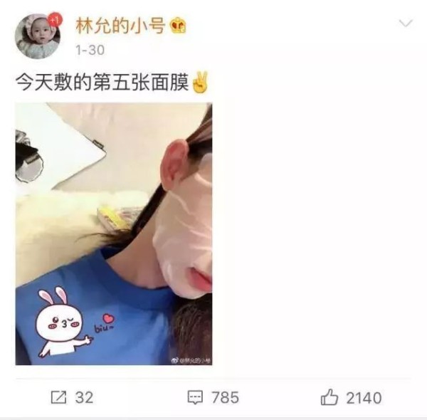虽然这么频繁敷面膜是小原不推荐的,但最近在用的Annabella海藻面膜,就是被林允种草的,之前她在微博小号po出敷这款面膜的照片,瞬间就火到不行。