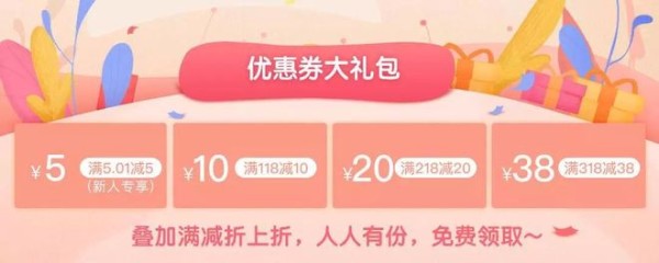 满5.01减5(新人专享),满118减10,满218减20,满318减38,人人有份,免费领取。