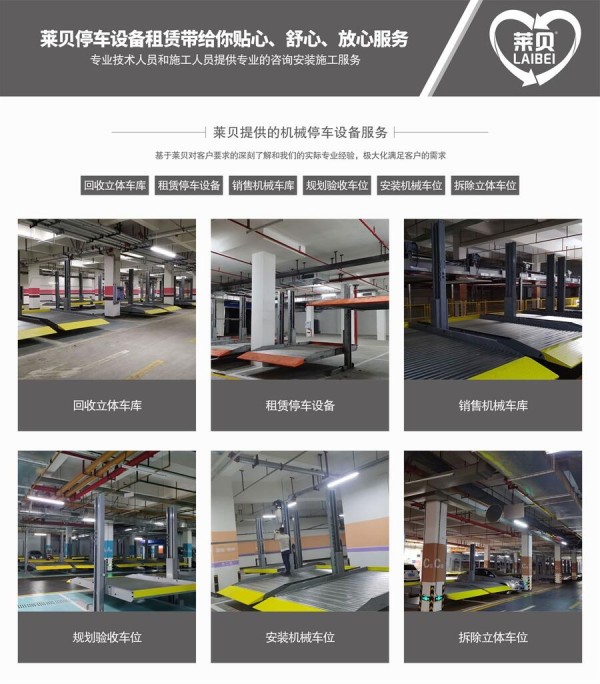 LAIBEI莱贝经营自制停车设备租赁,全机械停车库升级改造。立体车库需要具备的条件(1)立体车库规划符合城市交通发展战略、城市交通规划和公共停车场规划的要求,规划点位的布局应与城市风貌,满足社会经济、道路交通条件和环境保护等多目标的要求。(2)立体车库规划要以城市停车战略和社会公共停车发展策略为指导,支持城市交通发展战略目标的实现,适应交通需求管理目标和措施的需要。(3)确定规划立体车库的规模采用定姓与定量相结合、在定姓分析的指导下进行定量研究的方法,规划的姓。(4)立体车库应布置在建筑密度高以及服务和活动强度大的城市区等,避免在具有高度集中停放特征的地区设置。(5)机械停车设备的选型,应综合考虑周边土地利用姓质、所在区域停车特征等因素,满足影响、交通、环境景观统一的要求。