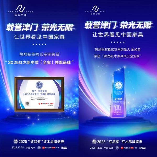拾贰空间在“红品奖”中一举斩获两项重磅荣誉:品牌蝉联“2025红木新中式(全案)领军品牌”;创始人金如箭荣膺“2025红木家具风云企业家”。双奖加持的背后,是业界对拾贰空间品牌战略转型的高度肯定,亦是对金如箭掌舵企业创新突围的深度赞誉。