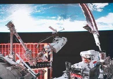 12月9日在北京航天飞行控制中心屏幕上拍摄的神舟二十一号乘组航天员张陆与武飞(右)在舱外工作的画面。