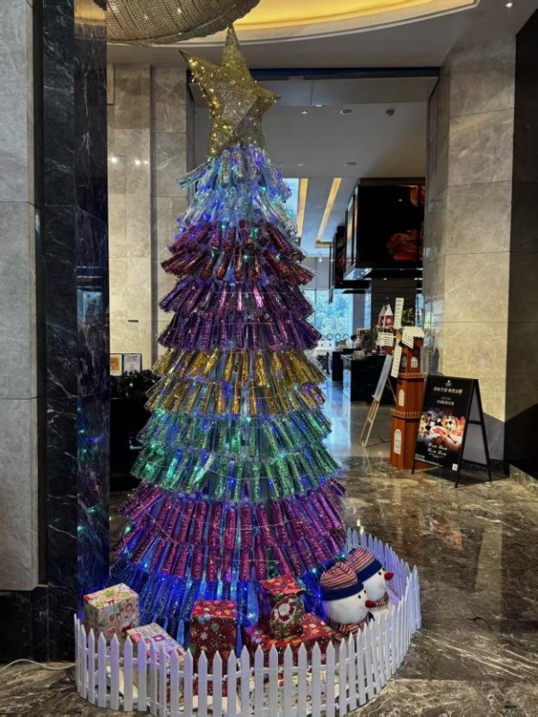 步入酒店,色彩绚丽的创意圣诞树瞬间抓住视线,流光溢彩的装饰搭配精致礼盒与可爱雪人摆件,将圣诞的浪漫氛围拉满。