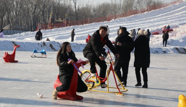 冰雪趣玩?亲子同乐互动区,是家庭游客的欢乐天堂。这里汇聚了雪圈、雪地摩托、雪地香蕉船、无动力雪地车、拉爬犁、冰陀螺、冰上自行车等12项冰雪游乐项目,风声与笑声交织,让游客感受冰雪上的“速度与激情”。