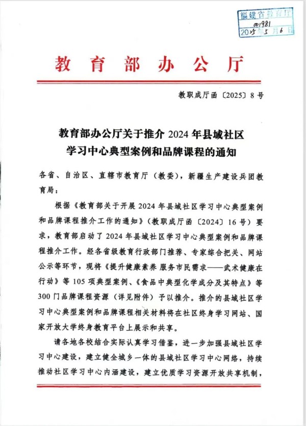 近日,教育部公布了《2024年县域社区学习中心典型案例和社区教育品牌课程推介名单》(教职成函〔2025〕8号),福建生物工程职业技术学院健康食品系张迅捷教授负责的《营养配餐设计与实践》课程成功入选“社区教育品牌课程”。该课程将在国家开放大学终身教育平台等官方渠道展示推广,为全国社区教育提供优质学习资源。