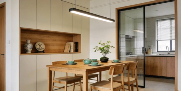 餐厅设计兼顾实用性与仪式感。选用长方形原木餐桌,搭配4-6把简约餐椅,桌面可摆放青瓷餐具、绿植盆栽,增添生活气息。餐桌上方悬挂一盏线性吊灯,光线聚焦于桌面,既满足用餐照明需求,又形成视觉焦点。