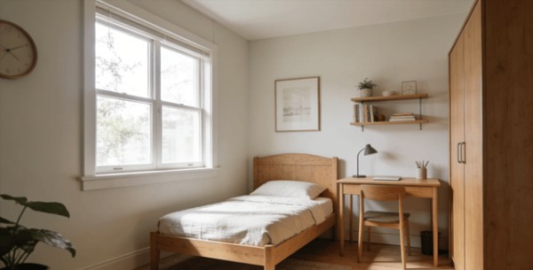 客卧面向访客或家人备用,设计简洁实用。摆放一张单人原木床,搭配小巧书桌与衣柜,满足睡眠、办公双重需求,软装搭配与主卧保持一致,确保整体风格统一。