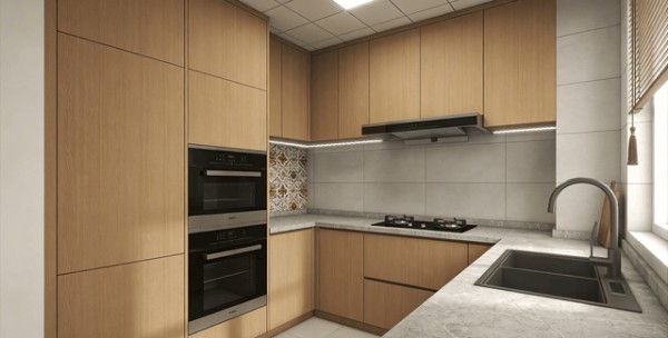 厨房与餐厅之间若有隔断,采用玻璃移门,既阻挡油烟,又保持空间的连贯性,让烹饪的烟火气与餐厅的雅韵自然融合。U型布局最大化利用空间,台面选用耐脏易清洁的浅灰色大理石,搭配原木色橱柜,无拉手设计保持线条流畅。墙面铺设浅灰色瓷砖,局部贴复古花砖点缀,避免单调;厨房电器嵌入柜体,保持台面整洁,契合宋式“有序”的理念。