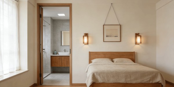主卧作为主人休憩空间,追求极致舒适与私密性。墙面选用浅米色乳胶漆,地面铺设原木地板,搭配原木双人床,床品选用素色棉麻材质,营造柔软静谧的睡眠氛围。床头背景墙无需复杂装饰,仅悬挂一幅简约挂画或摆放两个素色靠垫,搭配一盏原木壁灯,尽显雅致。主卫纳入套间,采用干湿分离设计,墙面铺设浅灰色瓷砖,搭配原木浴室柜与青瓷洗漱用品,让日常洗漱也充满仪式感。