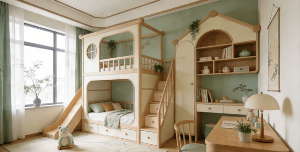 儿童房,可在宋式风格基础上增加柔和色彩与收纳空间,选用圆角原木家具,兼顾安全与美学,让孩子在雅致环境中成长。