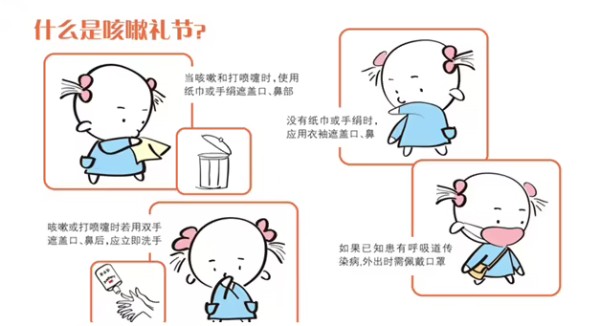 03.注意咳嗽礼仪咳嗽打喷嚏时,用纸巾捂住口鼻,无纸巾时用手肘代替,注意纸巾不要乱丢。