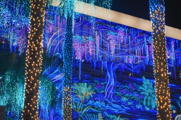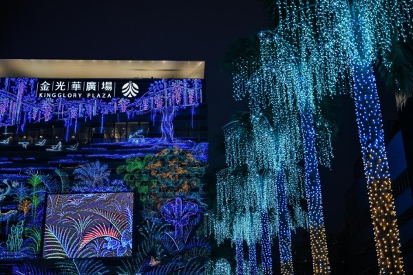 最为亮眼的是主立面上那棵高达35米的“紫藤光树”,发光的枝蔓如神经网络般向上延伸、舒展。垂挂的“流光星帘”模拟了森林中藤蔓与星光,正好与花坛中悄然“生长”出的蒲公英地插灯形成巧妙的呼应。这些元素共同构成了一片沉浸式的光之森林。