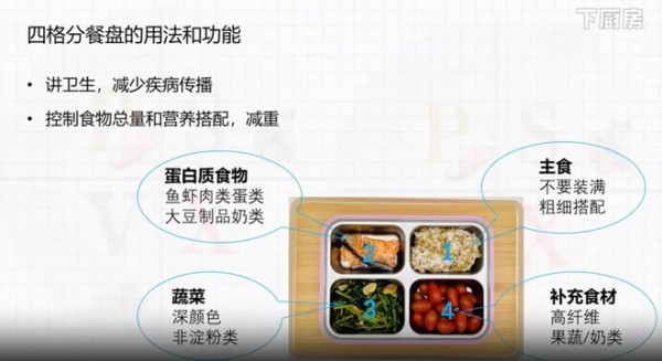 四格配餐法,是指用四格餐盘将主食、蛋白质、蔬菜和补充食材进行均衡细分,不再强调食物的克数。