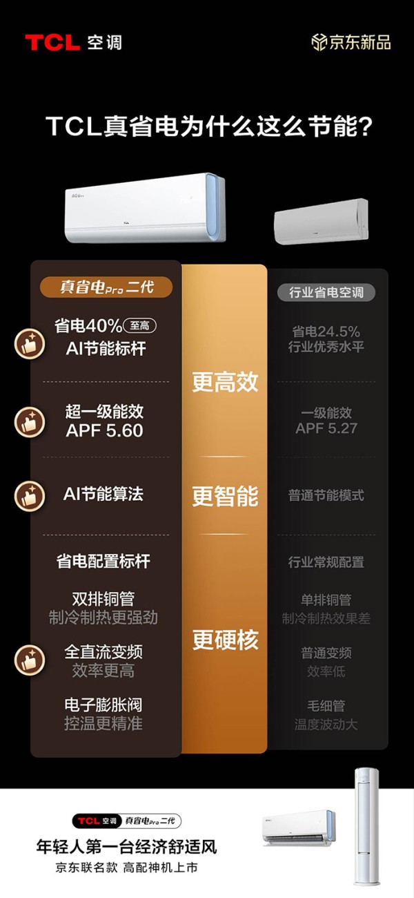 空调耗电高,俗称“电老虎”,针对年轻消费者“能省则省”“不舍得开空调”的痛点。TCL真省电Pro二代将节能省电表现提升到了新高度。其挂机超一级能效APF高达5.60,配合AI智慧节能算法,最高可省电40%。这种“开机即省电”的底气,让年轻人在炎夏深冬再也不必为了电费单而纠结,彻底实现空调自由。