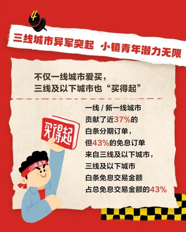 但令人意外的是,高达43%的免息订单,竟然来自三线及以下城市。这意味着,借助免息工具,小镇青年们获得了与大城市几乎同等的购买力。