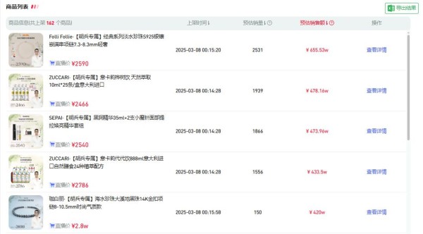 新红数据显示,该场直播预估观看总数达到86.6万,预估销售额达到4568.8万元。单品销售额排名前五中,有2款都是胡兵日常服用的保健品,单价均在2500元左右。