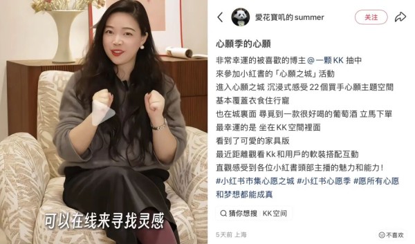 比如家居买手“一颗KK”在心愿之城打造了“KK的新家诊断室”,现场为大家的家“做诊断”,提出各类家居家装建议,让粉丝能够近距离感受到“一颗KK”的生活方式。