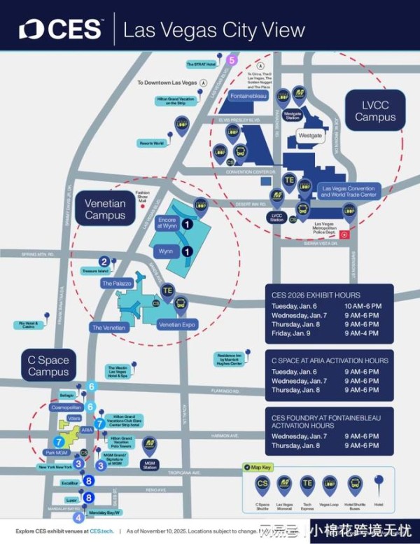 CES 2026主要在拉斯维加斯会议中心(LVCC)展开,跨越多个会场(共12个官方场馆),并分布在三个主要园区(Campus),分别容纳不同主题、不同类型的参展企业与活动。