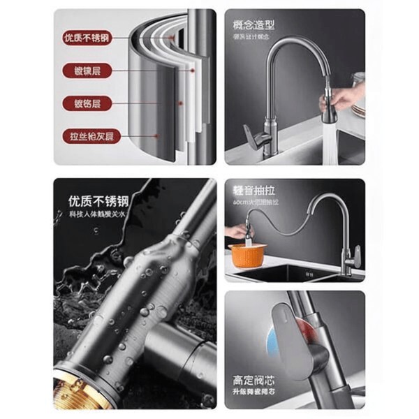 这款厨房水龙头以其独特的二合一设计而受到家庭主妇和厨师们的青睐,不仅是一款高效的抽拉式水龙头,还具备冷热水功能,满足不同的烹饪需求。它的三档出水模式使得你在清洗蔬菜、果品或进行日常清洁时,都能轻松切换水流模式,带来更灵活的使用体验。而且,这款洗菜池水槽龙头采用优质的201不锈钢材质,保证了耐用性与抗腐蚀性,让你的厨房用具常保如新,耐用不易损坏。