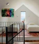 开放式的阁楼空间,很合适的摆放入这样两张小床,解决了客人突然留宿棘手的住宿问题,空间极为单调,完全通过一款艳丽颜色与丰富图案的大地毯来扭转平凡,增添舒适。