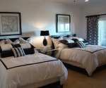 客卧中也要兼顾小细节,这款案例就有许多可取之处,比如额外增加的座椅以及沙发,让客人的晚间时间有了更多的支配空间。而墙角添放的屏风,可以用于更衣,也可以移动至两床之间作以分隔。