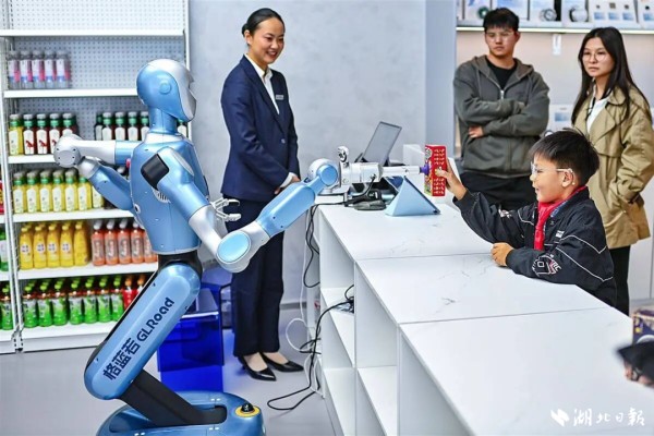 11月11日,全国首家人形机器人7S店在武汉光谷创新天地商业公园开业,店内商店的售货员是机器人。(湖北日报全媒记者 朱熙勇 摄)