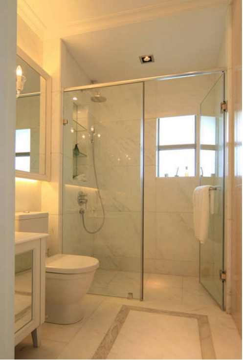 长方形的农村卫生间做到了干湿分离,各功能区合理划分,方便清洁打扫;白色瓷砖装饰的墙面和地面,营造纯净整洁的浴室空间,配以白色卫浴洁具和浴室柜,整体风格更加一致;玻璃隔断与白色瓷砖搭配,空间更显通透。