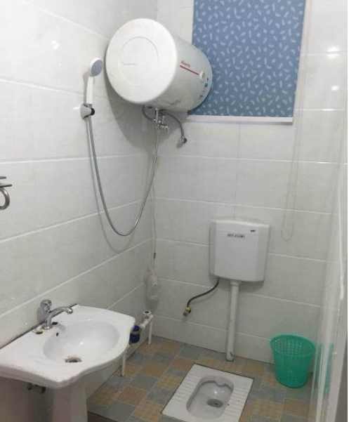 洗手台、淋浴区、蹲厕全部纳入一个空间下,虽说使用起来不是很方便,但对于农村环境来说已然不错了。白色方形瓷砖装饰了卫生间墙面,同时还具有防水功效;地面则采用拼色地砖装饰,为原本简单纯净的空间注入一丝色彩。