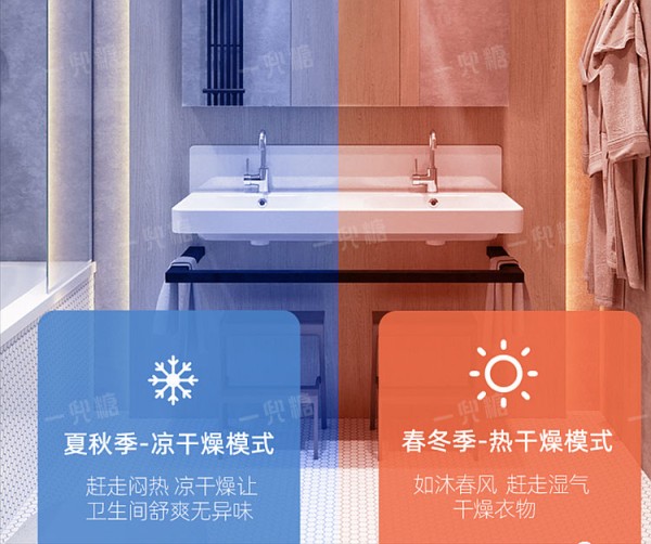 干燥功能:分为凉干燥、热干燥功能。适合一年四季使用,核心是开启干燥动能后松下浴霸自动开启换气功能,也是松下浴霸的独家技术。凉干燥:可以在夏日沐浴时赶走炎热,梅雨季节防止室内返潮。热干燥:边取暖边防止水汽弥漫,也可以让小件衣物快速风干。