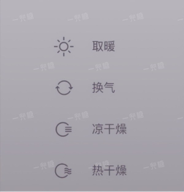 干衣功能:干衣功能很省心,也是我特别激动的发现。日式浴室中浴霸非常常用的功能。遇上阴雨天,或者是没有地方晾衣服的情况,就可以用浴霸来风干。用浴霸吹吹,干的很快。非常实用的功能。可以为家庭环境节约晾衣空间。热干燥功能烘衣服效果特别好。一边干燥一边通风,效率高。
