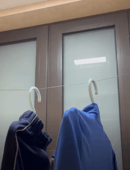 干衣小测试:我家使用的是隐形晾衣绳进行悬挂,平时可以收纳起来。大家都知道,要想晾干衣服,温度和空气流通是重点。我们就将松下浴霸FV-TB30KL1开到热干燥档位,来看一下在松下浴霸下的干衣效果。