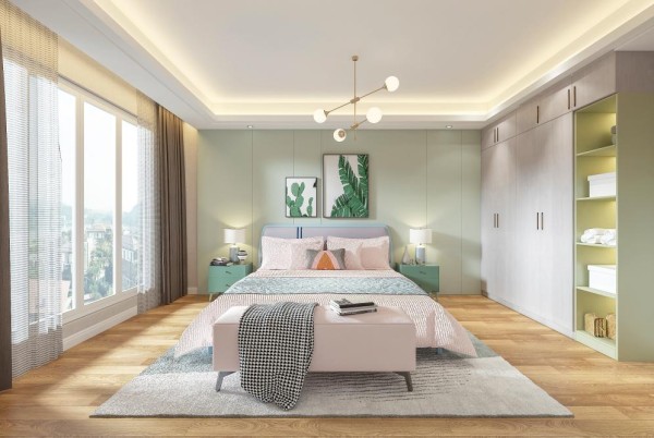 卧室作为休息的地方,在色彩搭配时不宜选择饱和度过高的鲜亮色系,尽量选用较为柔和淡雅的色系,可以和屋内软装互相搭配,能让我们感到放松,帮助我们快速入眠,缓解疲惫感。