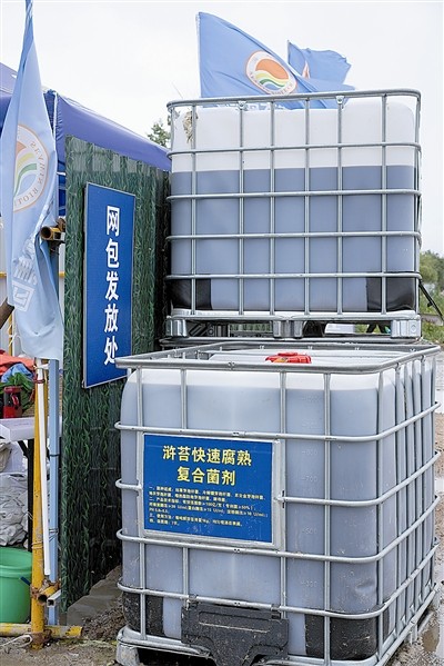 ■图①通过无人机喷洒复合菌剂对浒苔进行腐熟处理。