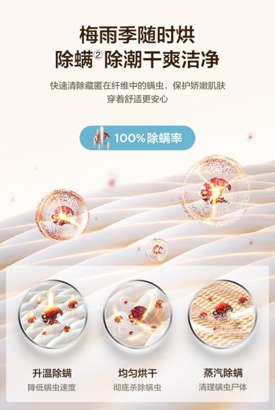 考虑到雨季潮湿环境易于滋生细菌,美的初见系列洗烘套装从洗衣、干衣两个方面着手,让每一件衣物的有害细菌无所遁形。洗衣过程中,搭载的C.T感应式净螨通过高温蒸汽洗涤、60摄氏度恒温洗涤、水流聚合技术、澎湃水流冲洗四个步骤,能够有效去除隐藏在洗衣中的螨虫细菌,将表层里层都清洗得干干净净,达到100%除螨率。