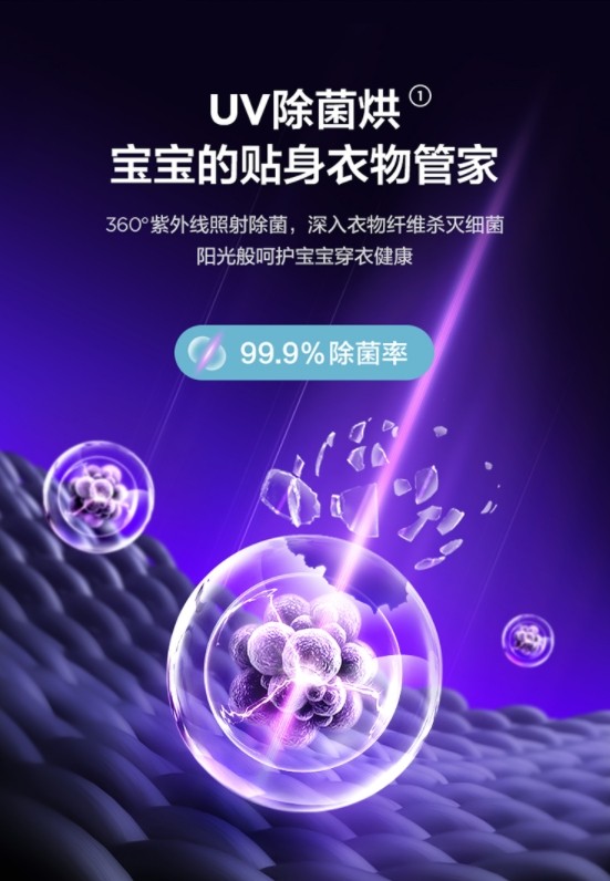 在干衣过程中,机身内置了UV紫外线杀菌灯,配合不锈钢筒身反射,能够实现360°无死角照射除菌,深入衣物纤维内部杀灭细菌,除菌率达到了99.9%。有效免除螨虫和有害菌对于家人身体皮肤的困扰,带给衣物如阳光晾晒般的效果。