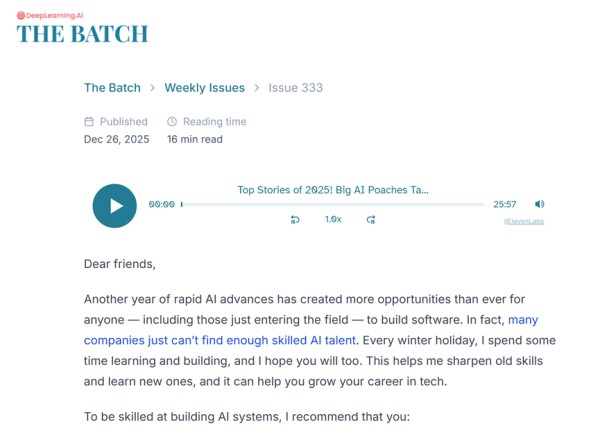 2025年可能会被铭记为AI工业时代的开端。创新将模型性能推向新高度,AI驱动的应用变得不可或缺,顶级公司为熟练从业者展开争夺战,基础设施建设推动了美国国内生产总值增长。与过去的寒假季节一样,本期特刊《The Batch》追溯了过去12个月的主要主题。来年有望巩固这些变化,我们将把这项技术更紧密地编织进日常生活的结构中。