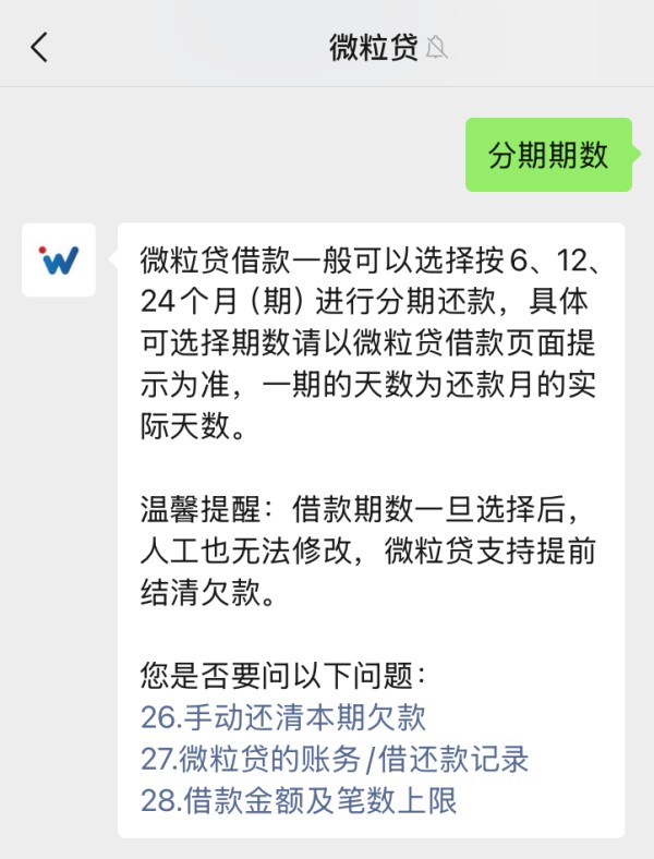 微粒贷最新授信额度区间为500元-20万元,可循环使用,只要账户状态正常且可借额度≧100元,就可以再次申请借款,最多可申请20笔。分期还款方面,微粒贷提供了多种分期选择,常见的有6期、12期、24期等多种选择,具体以页面显示为准。
