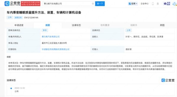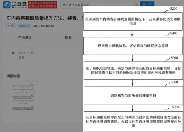 企查查APP显示,近日,赛力斯汽车有限公司申请的"车内乘客睡眠质量提升方法、装置、车辆和计算机设备"专利公布。