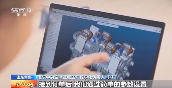 总台记者 曹俊懿:在传统工厂,生产线如果要换型号往往意味着大量的重新调试。但是在这一条产线上,下线的却是各种细节、形态各不相同的中央空调产品。秘诀就在于智能生产系统会提前调节参数,让各个关键工序的设备,面对不同订单的产品能够实时调节自己的动作。这样一来,不同的订单就能够在一条产线连续不断地生产,哪怕只有一件商品的订单,也能够无缝衔接进这样的产线。