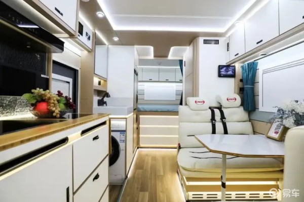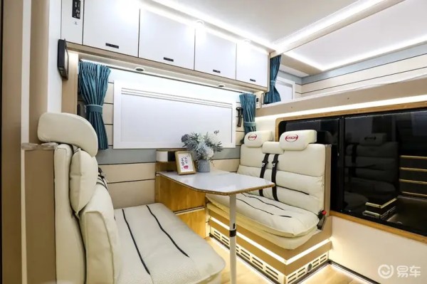 驾驶室上方的单人床尺寸为2100×1100(毫米),。客厅的4人对卡座沙发填充柔软,内置羽绒材质,乘坐舒适性极佳,是轻卡房车中布局的不二之选。