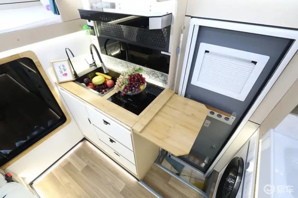 会客区对面是前置大厨房,台面上方配备了家用双排气抽油烟机,有效解决烹饪时的油烟问题。台面设有尺寸较大的洗菜池,包含独立的饮用水取水口和洗菜取水口,方便日常生活使用。右侧的电磁炉尺寸合适,搭配翻折板,进一步增加了操作台的置物空间,满足烹饪需求。