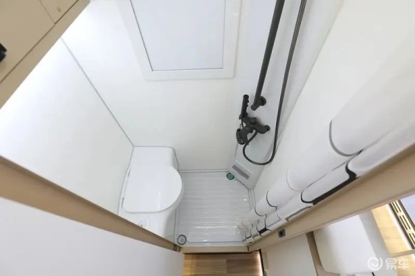 洗漱台外置后,卫生间内部布局简约,配备了固定式坐便器和抽拉式黑水箱(19.8L)。成年人在其中进行简单淋浴毫无问题。独立的淋浴系统、320升的净水箱和即热式热水器,确保了热水供应,满足一家2-3口人5-7天的用水需求。污水箱容量为70升。
