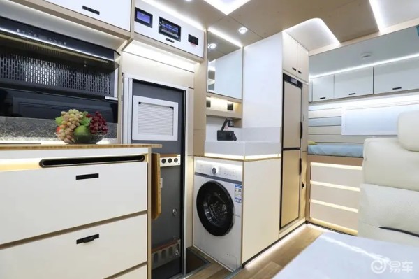 卡居500将洗漱区独立于卫生间之外,这一设计不仅提升了卫生间的使用空间,还使得过道更加宽敞。洗漱台上方的带镜面隐藏收纳柜,为女性用户提供了存放化妆品的便利。正下方的TCL品牌8公斤洗衣机,满足日常衣物清洗需求,让旅途生活更加便捷。