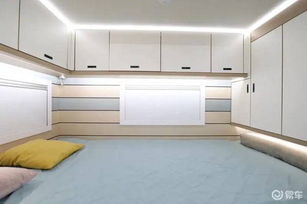 尾部休息区采用横置床设计,尺寸为2100×1300毫米,能够满足双人休息。环绕式储物柜设计提供了丰富的收纳空间,足以容纳旅途所需的衣物和杂物,即使是长期旅居,四季衣物和换季棉被也能轻松收纳。