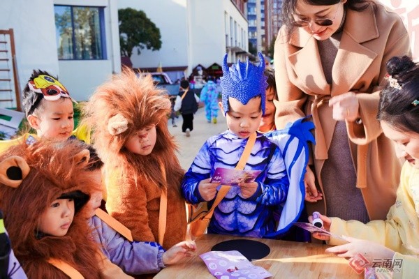 在游园体验活动中,幼儿园精心设置了云南地方特色美食摊点、皮影小剧场、编制中国结、古法造纸等34个摊位,等待小朋友积极参与互动,让快乐翻倍。幼儿则化身“彼得潘”“公主”“骑士”等经典角色,穿梭于活动体验区内。他们在手工创作中迸发出创意火花,在体育游戏中锤炼协作能力,在美食品尝中感受民俗温度,在角色互动中丰富语言表达。
