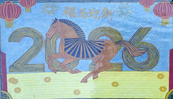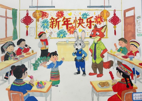 低年级学生以“元旦的快乐时光”为主题,孩子们用斑斓的色彩描绘出奔腾的骏马、喜庆的灯笼、热闹的团圆饭,一幅幅充满想象力的画作,展现了他们对美好生活的向往与纯真祝福,表达了对新年的美好期许。