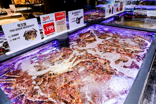 为让餐桌选择更加丰富,水产区迎来重磅升级:不仅面积大幅扩充,更依托专业化冷链物流体系,实现了跨越千里的 “鲜货直送”。澳龙、东星斑、珍宝蟹、波龙等鲜活海鲜在定制水柜里自在游弋,实现 “海边鲜货,青城上桌”,让呼和浩特的消费者无需远行,在家门口就能畅享深海鲜味。