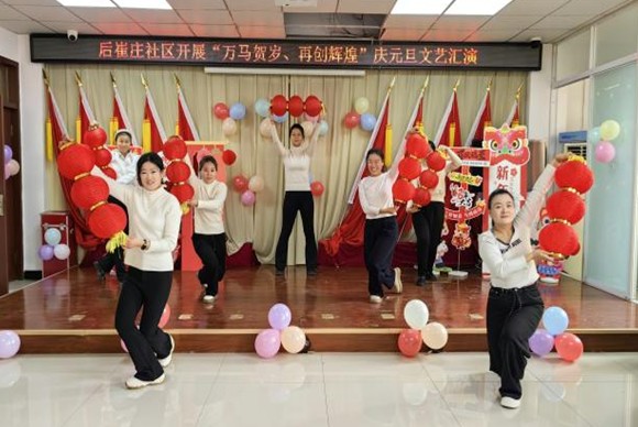 元旦前夕,后崔庄社区活动中心里暖意洋洋,“万马贺岁·再创辉煌”文艺汇演热闹开场。为了让大家在喜庆的氛围里迎接新年,也为了丰富居民的精神文化生活、拉近邻里关系,社区工作人员、老党员和辖区居民聚在一起,用自编自演的节目,共同迎接新年的到来。